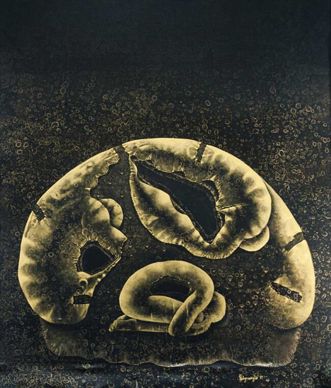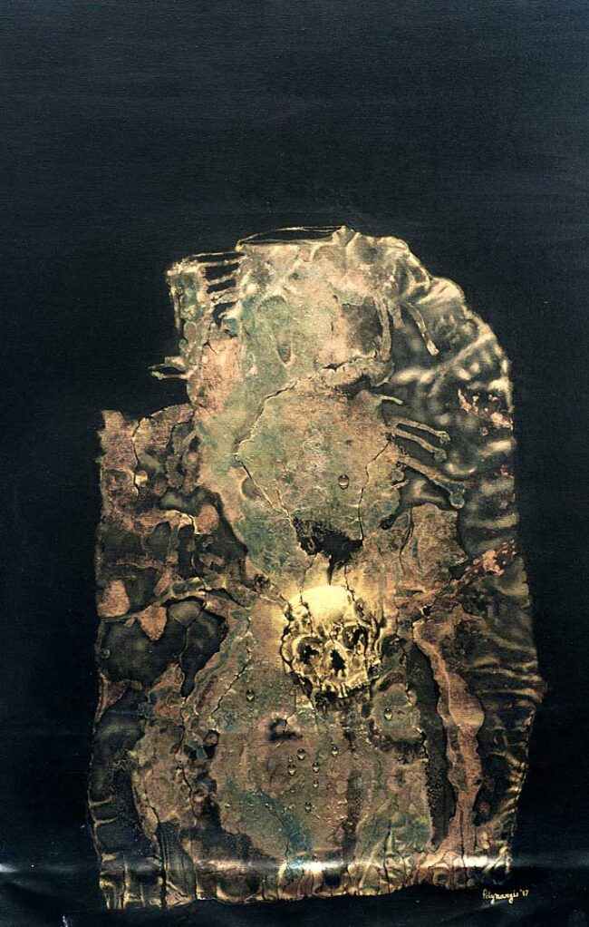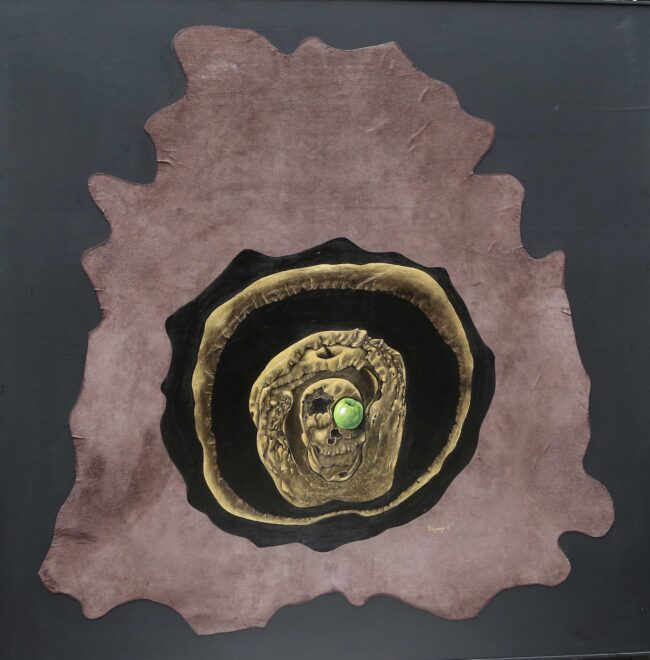 TITLE : ENVY (Adaptation: Milton’s Paradise Lost) MEDIA : Acrylic on Leather SIZE : 182 cm X 182 cm YEAR : 2017 Jealousy finds its roots from the creation of this universe. Satan being envious with Adam and Eve’s status, devised a plot to oust them from Heaven. On earth, this legacy still continues. Evil-minded…