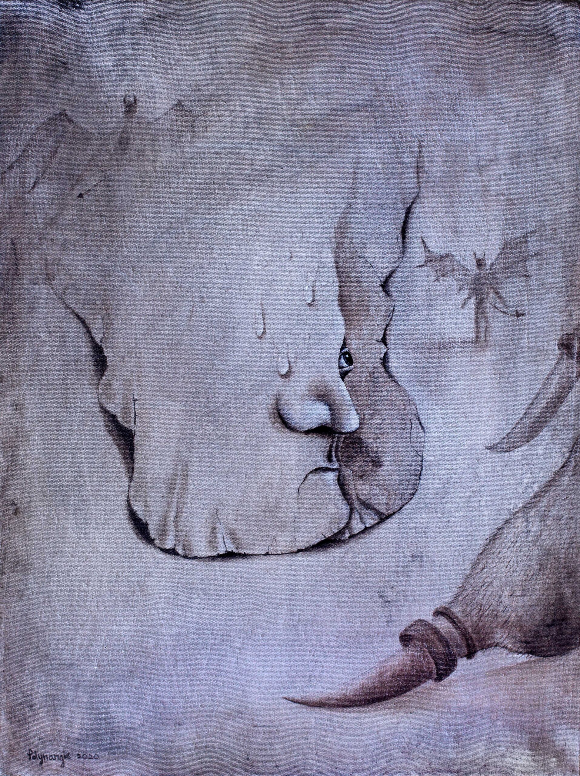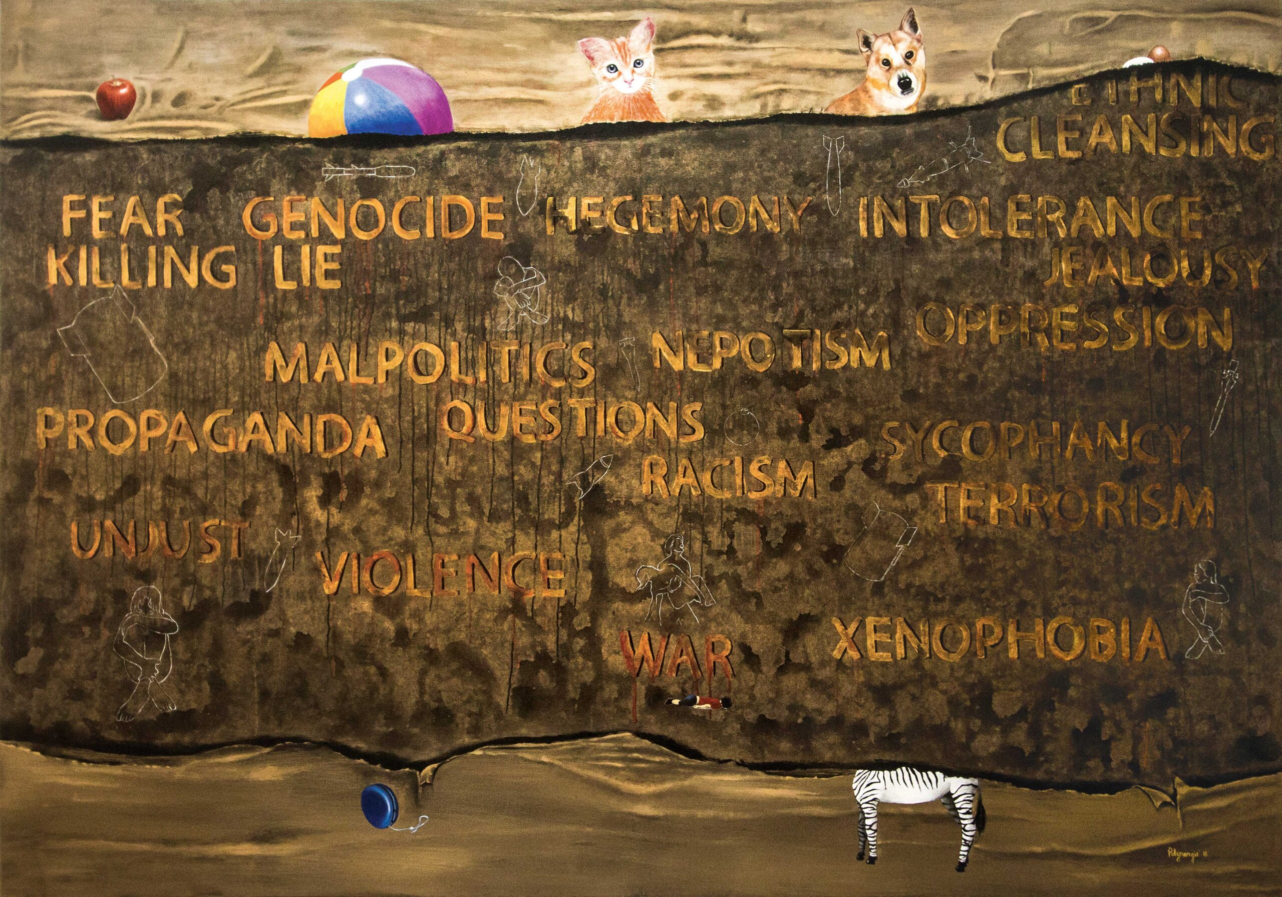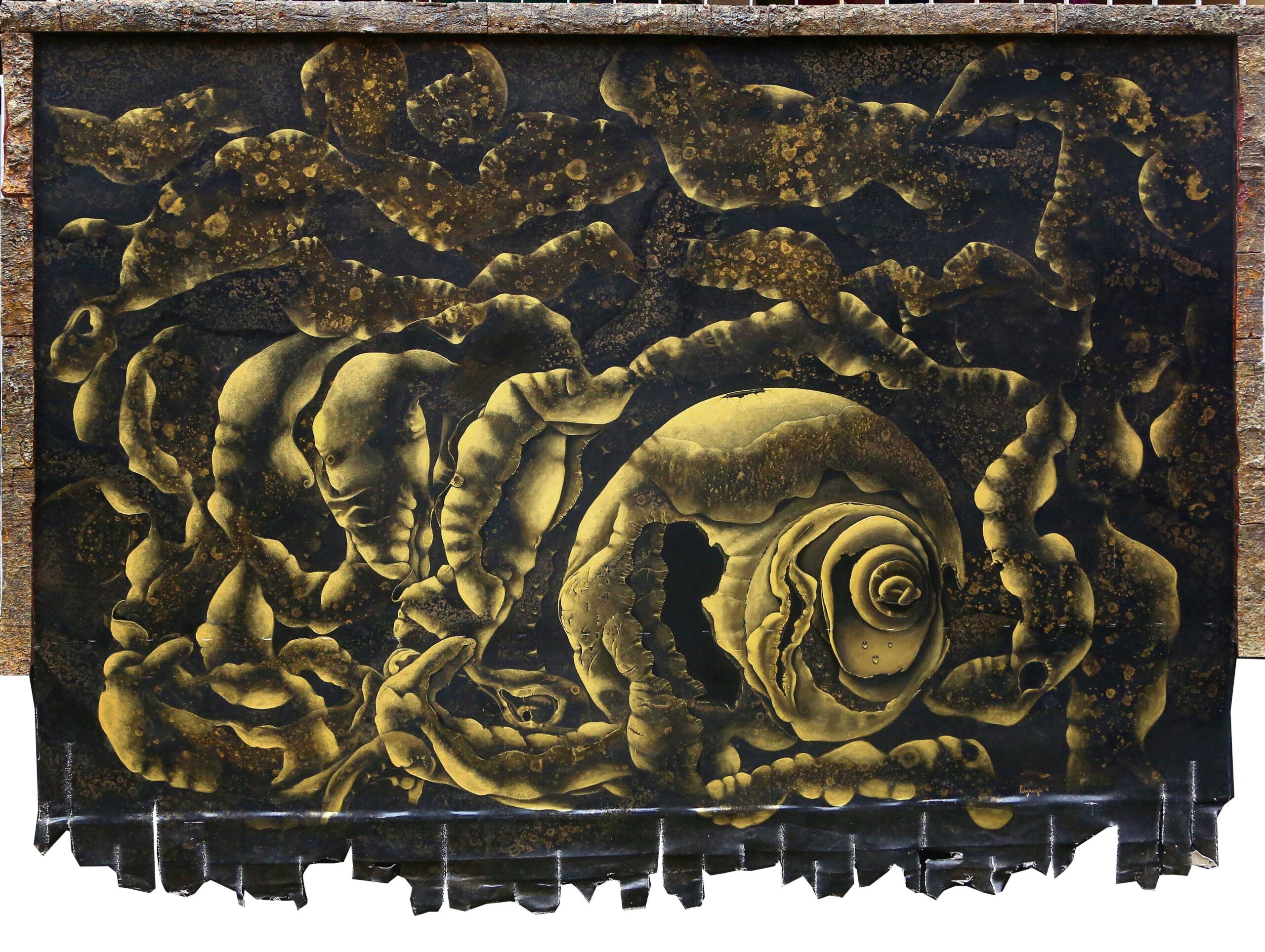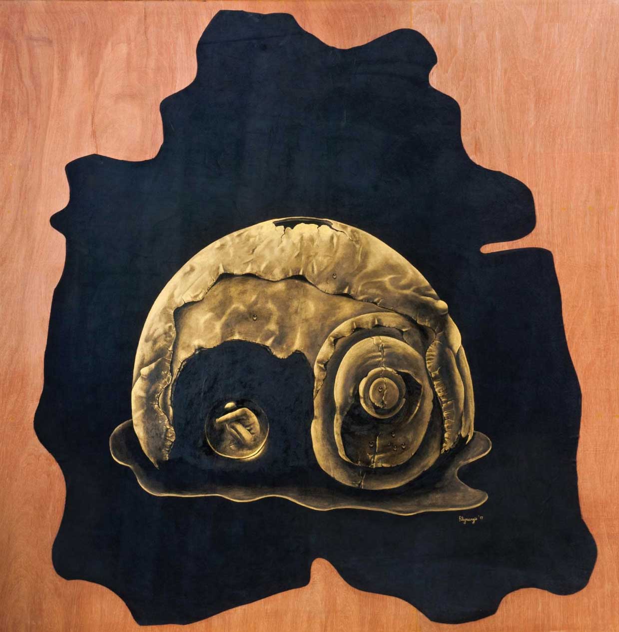 TITLE : ENVY (Adaptation: Milton’s Paradise Lost) MEDIA : Acrylic on Leather SIZE : 182 cm X 182 cm YEAR : 2017 Jealousy finds its roots from the creation of this universe. Satan being envious with Adam and Eve’s status, devised a plot to oust them from Heaven. On earth, this legacy still continues. Evil-minded…