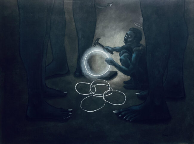 TITLE : Usurped Sanctity MEDIA : Acrylic on canvas SIZE : 121.92 cm x 91.44 cm YEAR : 2025 This painting explores the performance of goodness that disguises an inherently evil nature. The halo functions as a symbol of moral virtue—something genuinely good people carry invisibly and effortlessly. In contrast, those with corrupt intentions…
